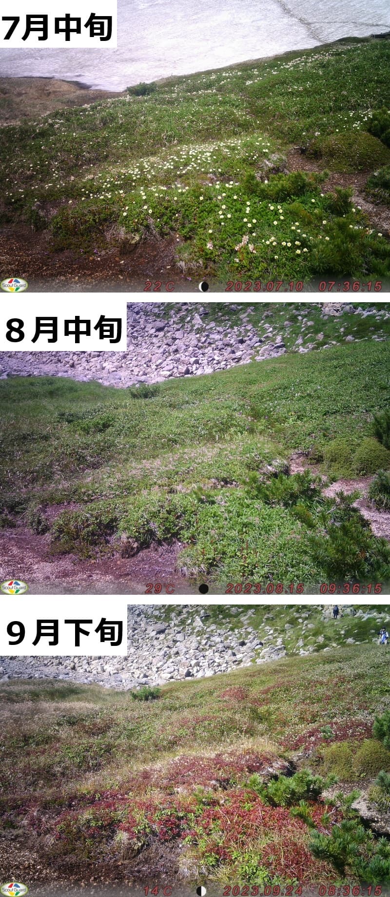 「モニタリングサイト1000高山帯調査」で行われている調査の1つで、調査対象種の開花が確認できる場所にインターバルカメラを設定し、1~2時間おきに写真撮影を実施するものです。